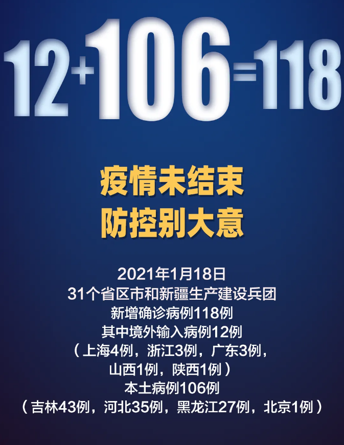 1月18日0—24时,31个省(自治区、直辖市)和新疆生产建设兵团报告新增确诊病例118例,其中境外输入病例12例,本土病例106例(吉林43例,河北35例,黑龙江27例,北京1例);新增无症状感染者91例(境外输入11例),当日转为确诊病例60例(境外输入1例)。