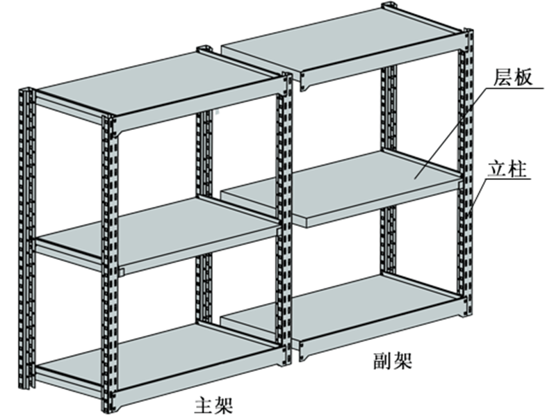 4、横梁与立柱片挂接组装成框架,最后铺设钢层板,至此一组完整的中型货架成型。