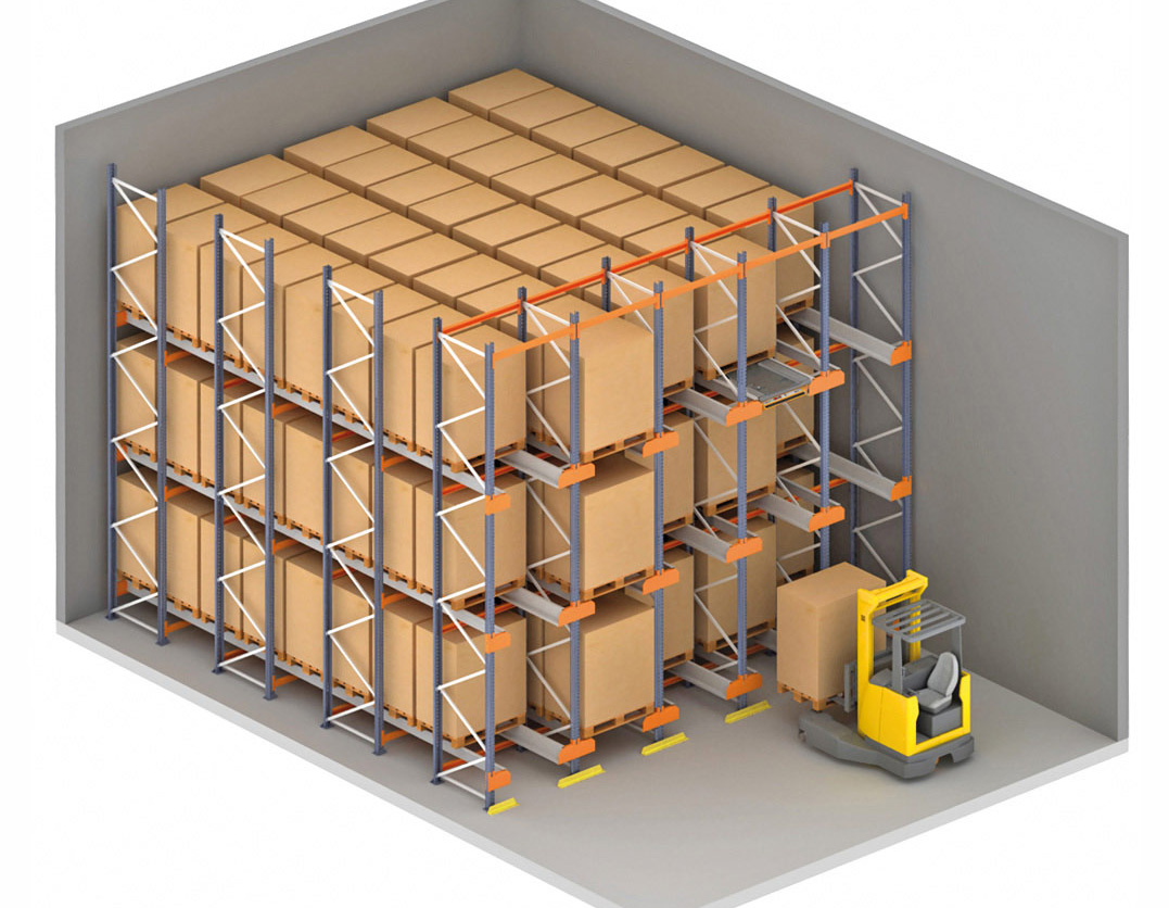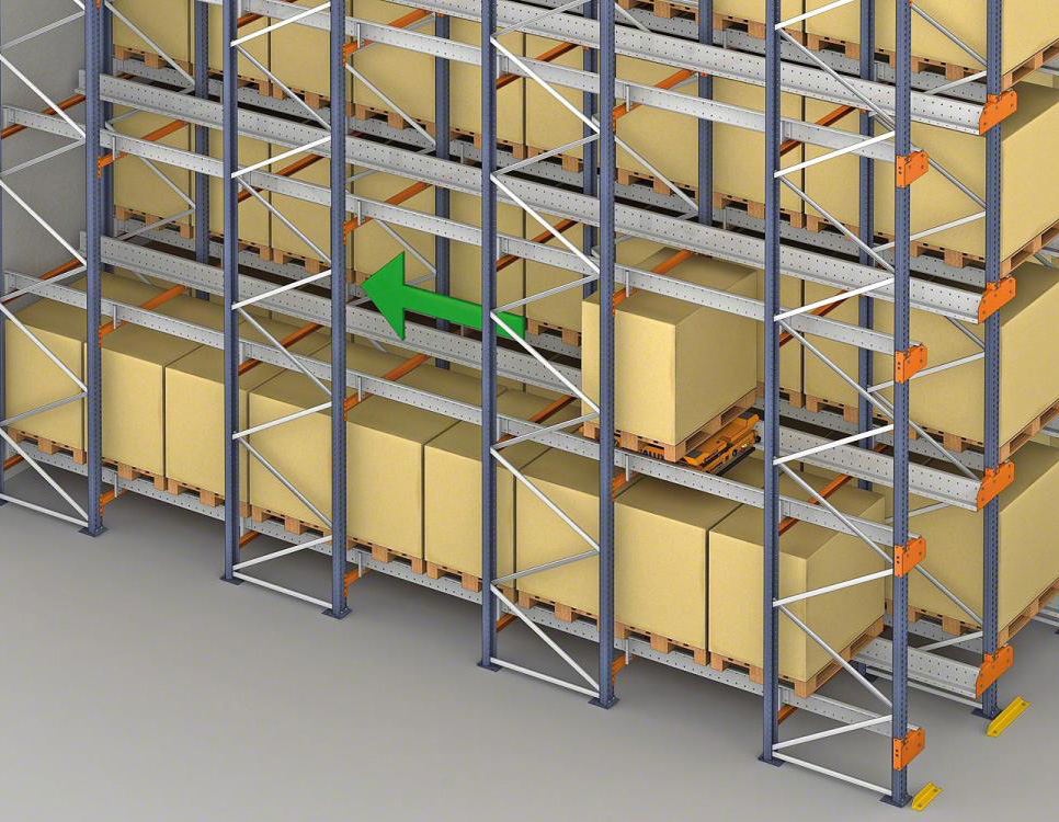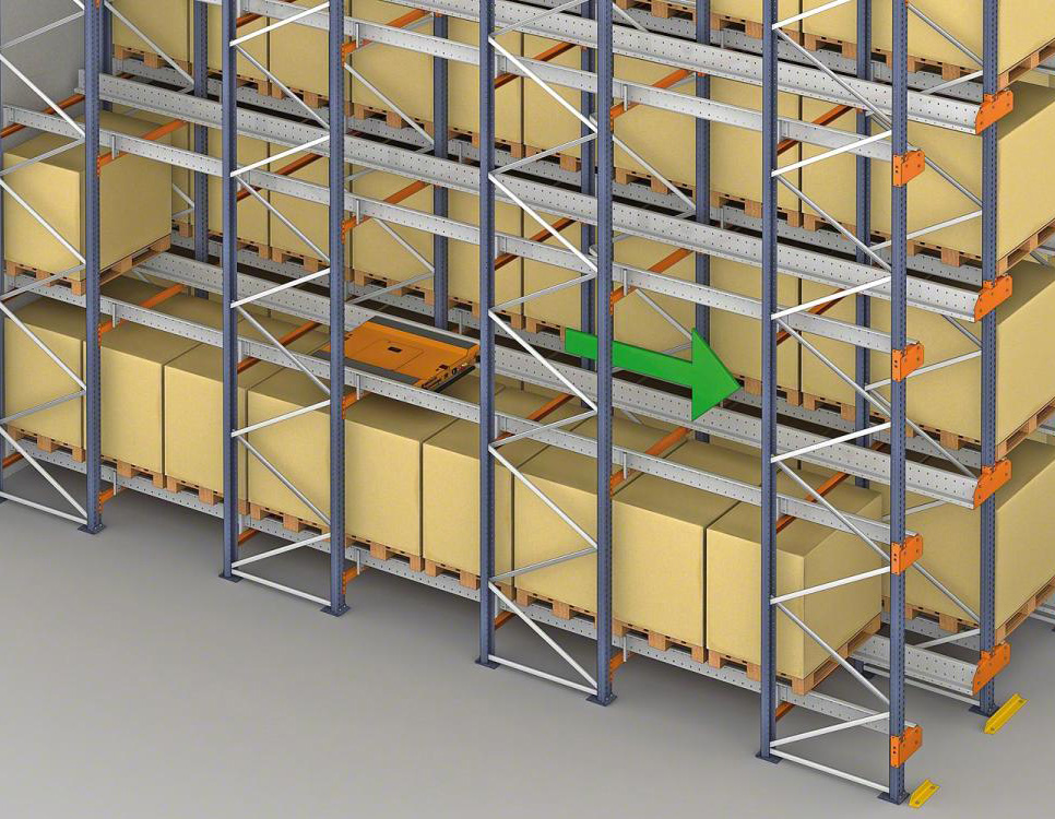 货物从巷道一端存入,另外一端取出,这种模式可以作为两个区域的缓冲区或适用于固定的货物存储。当巷道存放未满时,穿梭车会将重新排入列托盘位置使之紧密排列,以存放更多托盘。